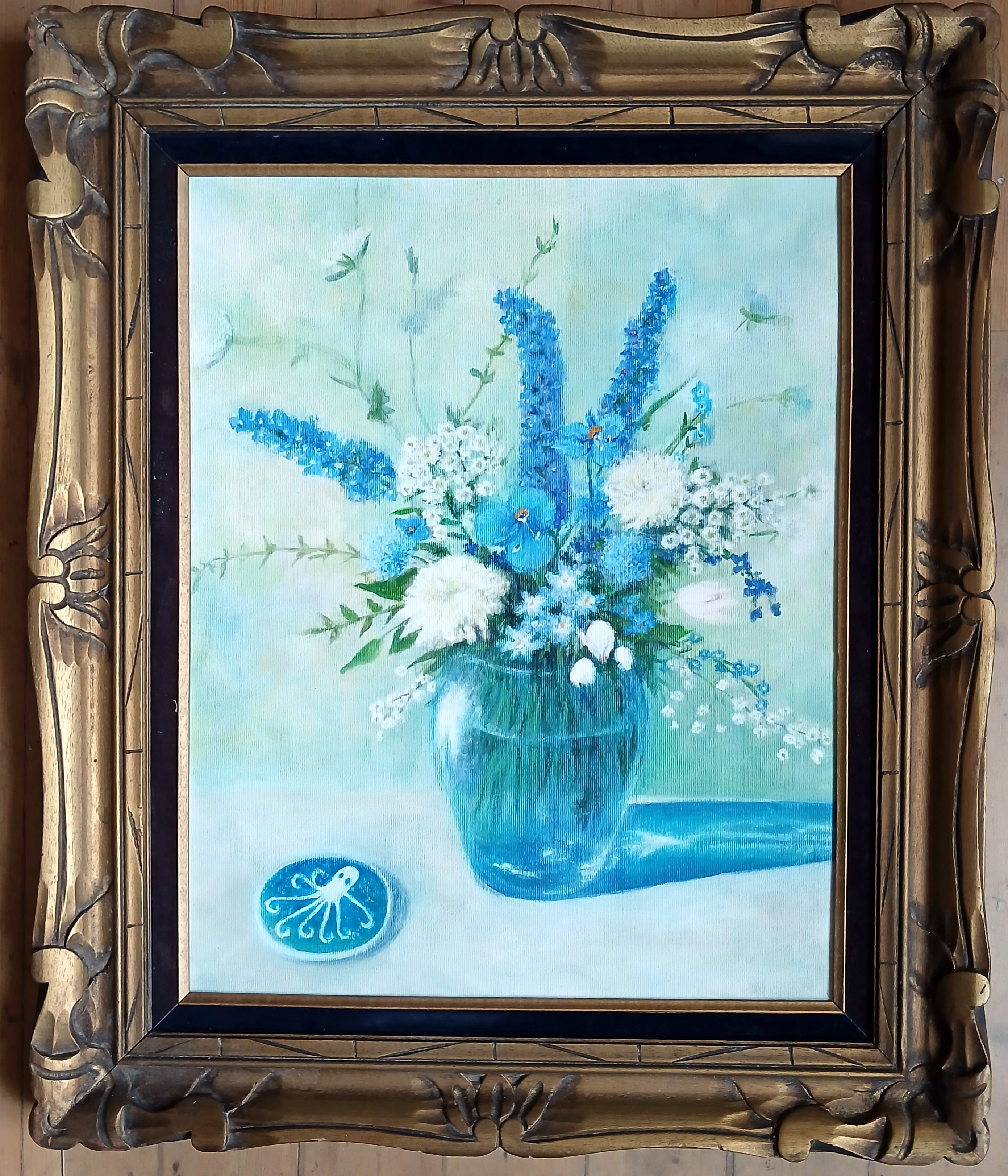 Jag håller på med en serie med blomstermålningar. Min senaste målning är en blomstermålning i akryl med en blåvit bukett.